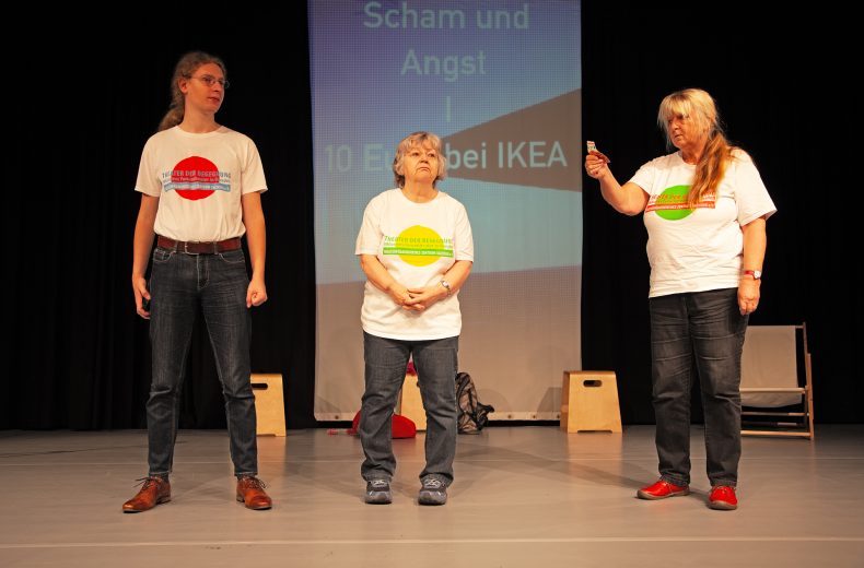 Und da auch auf die Bühne gehen Überwindung braucht, können Sie dies fast ganz konsequenzenfrei ausprobieren. Denn wir möchten nach unseren Szenen mit Ihnen gemeinsam am Mut-Haben arbeiten, ein anderes Handeln testen – und zwar im gemeinsamen Spiel. Das einzige Risiko wäre, dass es Spaß macht. Gehen Sie das mit uns ein? Haben Sie Mut?